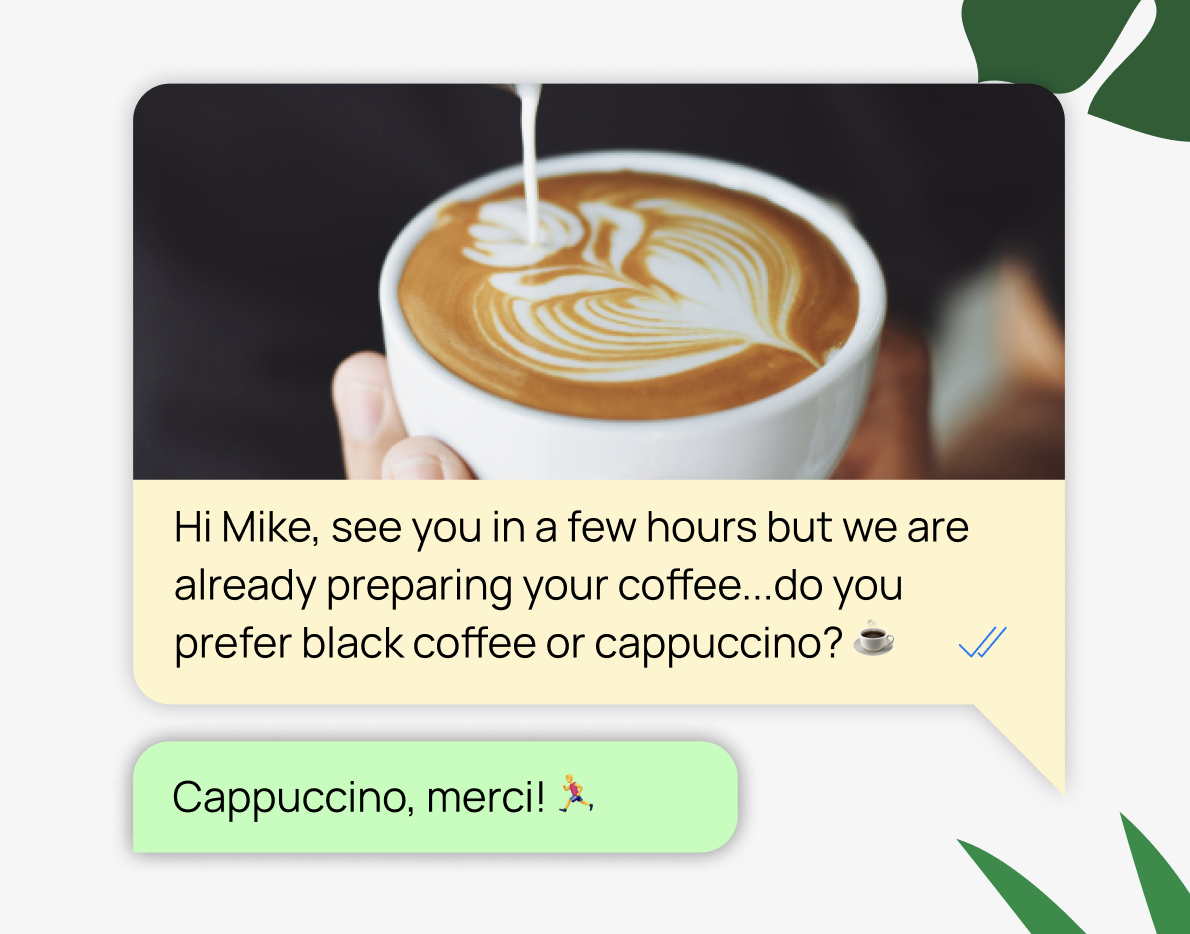 - SMS/Text Messages: Text messages are perfect for quick updates and reminders, such as check-in times, reservation confirmations, and promotional offers. With an open rate of 98%, SMS is highly effective in ensuring that guests receive important information promptly. (Learn why your hotel needs WhatsApp)